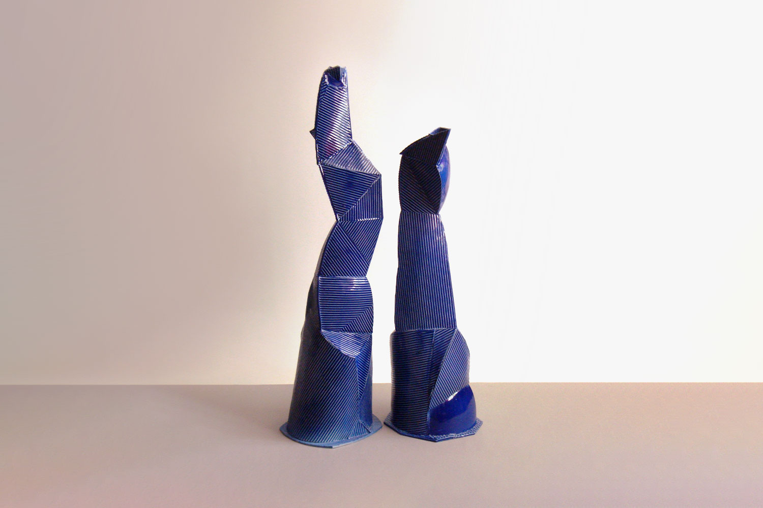 These two blue handmade ceramic objects were inspired by the ancient architecture of Ihor Kovalevych's native city. The hollow towering sculptures are decorated with a marine blue glaze. Ihor tries to create his ceramic pieces as sculptures or architectural objects, with material, texture and colour as his building blocks. The two stoneware sculptures were glazed and fired in a gas kiln at 1230°C.