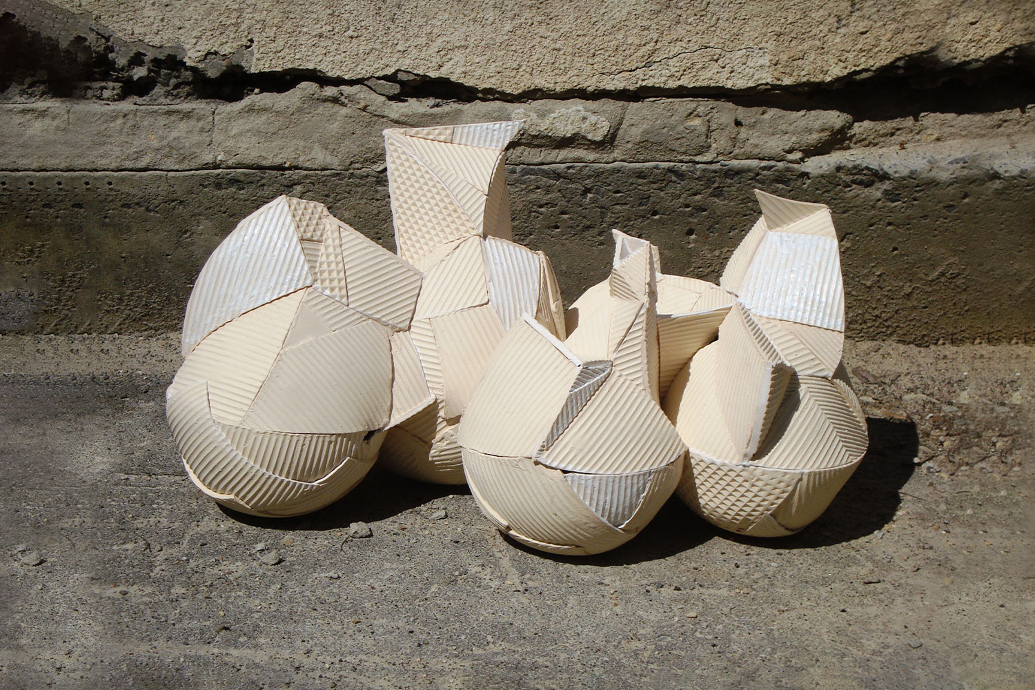 This work combines several similar objects to create an overall sense of playfulness. The walls of the stoneware sculptures have been textured with regular lines. The sculptures are made from various combined elements which have purposefully been left evident. Ihor likes to approach his works from an architectural standpoint. He sees materials, textures and colours as his building blocks.