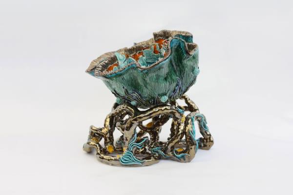 This sea creature born in Catarina's imaginary ocean came to life while she was spontaneously modelling clay, playing with low temperature glazes and incorporating other elements such as the transparent glass flowers.