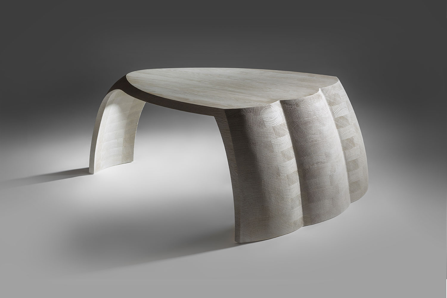 This sculptural coffee table was hand carved and shaped using bleached white oak. The top was sanded to a smooth finish, while the contrasting textured surfaces of the sides were achieved by sandblasting.