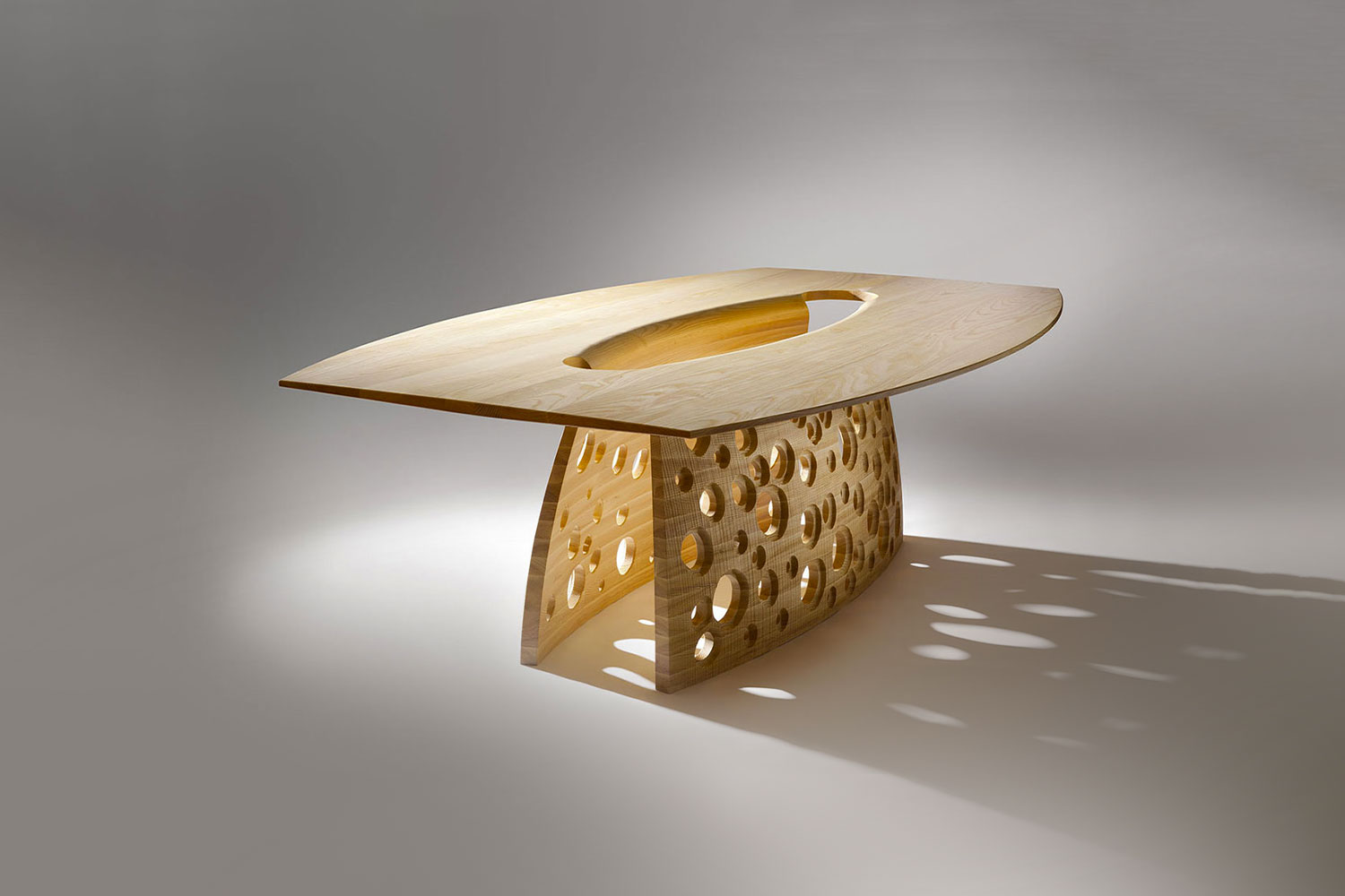 Ireland's coastline and natural erosion were the inspiration behind this ash dining table. The piece was hand carved, shaped and sandblasted, resulting in a surface evocative of weathered drift wood. The design allows light to flood through the piece.