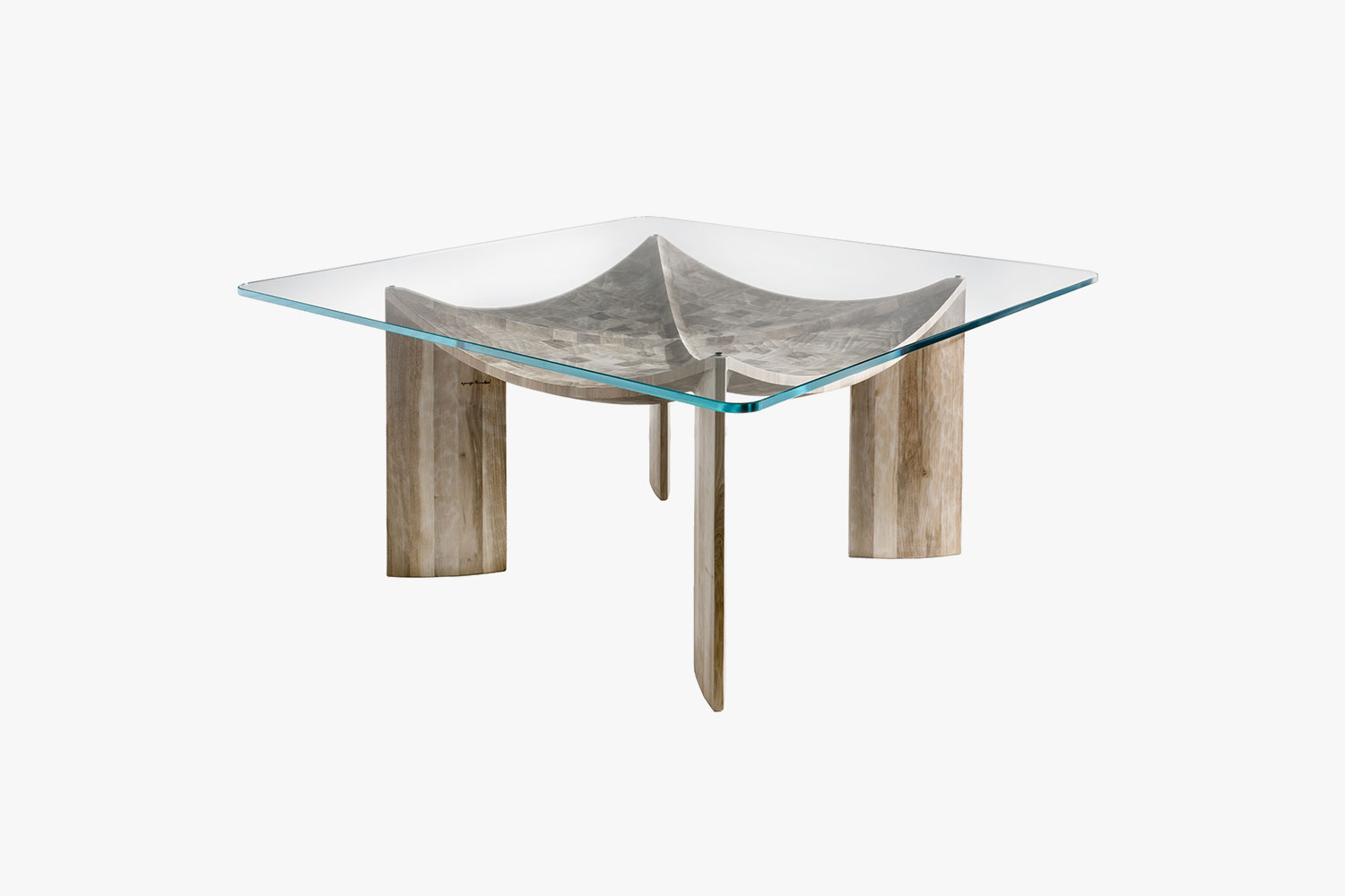 This monolithic structure, a hand carved table in Italian walnut wood with a glass top, was created with the wood grain travelling vertically. A gouge was used to carve the surface of the table. The glass rests on rubber caps.