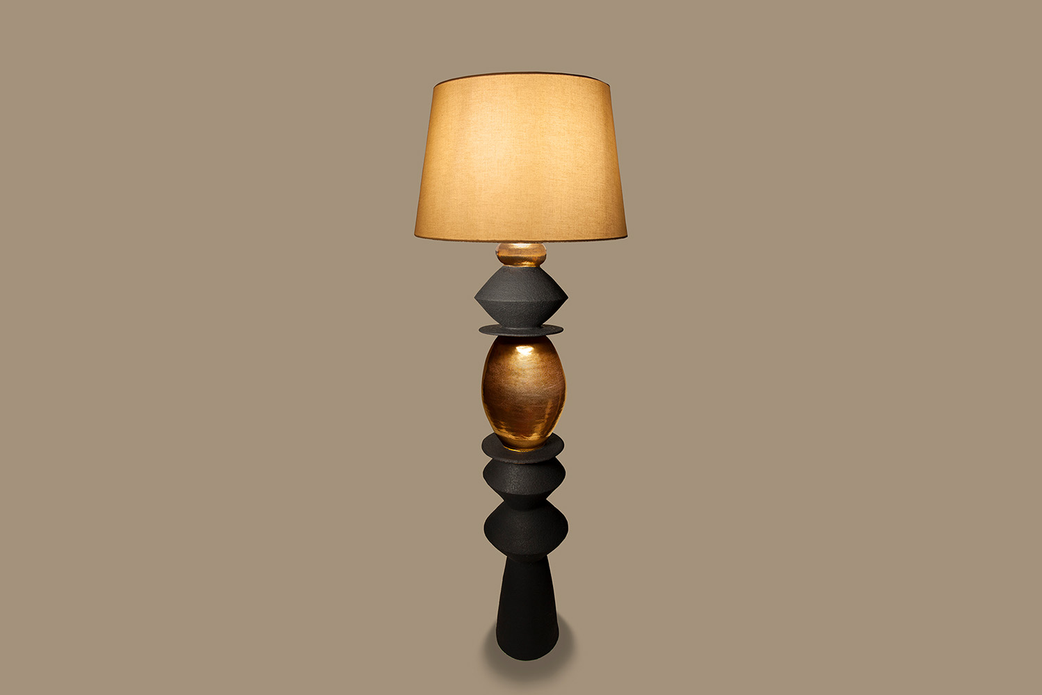 This lamp base is inspired by the Native American totem artwork, with a variety of different ceramic shapes put together. The 24-carat gold used is intended to symbolise hope.