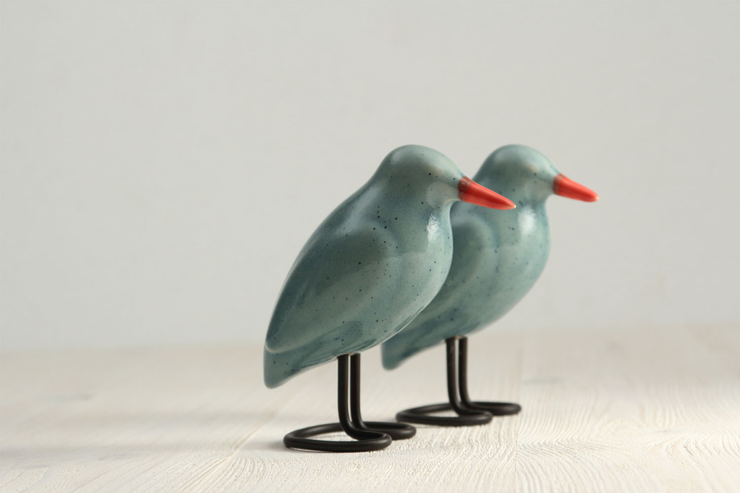 These decorative ceramic kingfishers were inspired by the birds living by Polish rivers. They were hand shaped, fired and glazed, before going through a second session of firing at 1100°C. The birds' legs are made of lacquered steel.