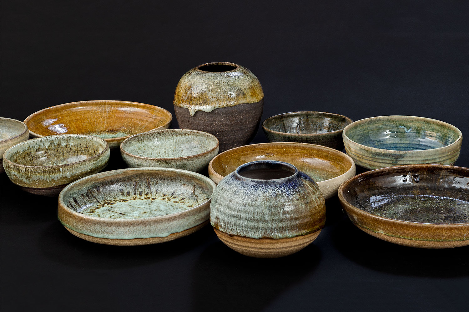 This is a collection of unique stoneware bowls and vases with multiple glazes developed by Anni Paunila. She uses multiple glazes in layers to create a unique surface, with colours ranging from blue to ash grey and brown. The glazes create a thick and colourful coating.