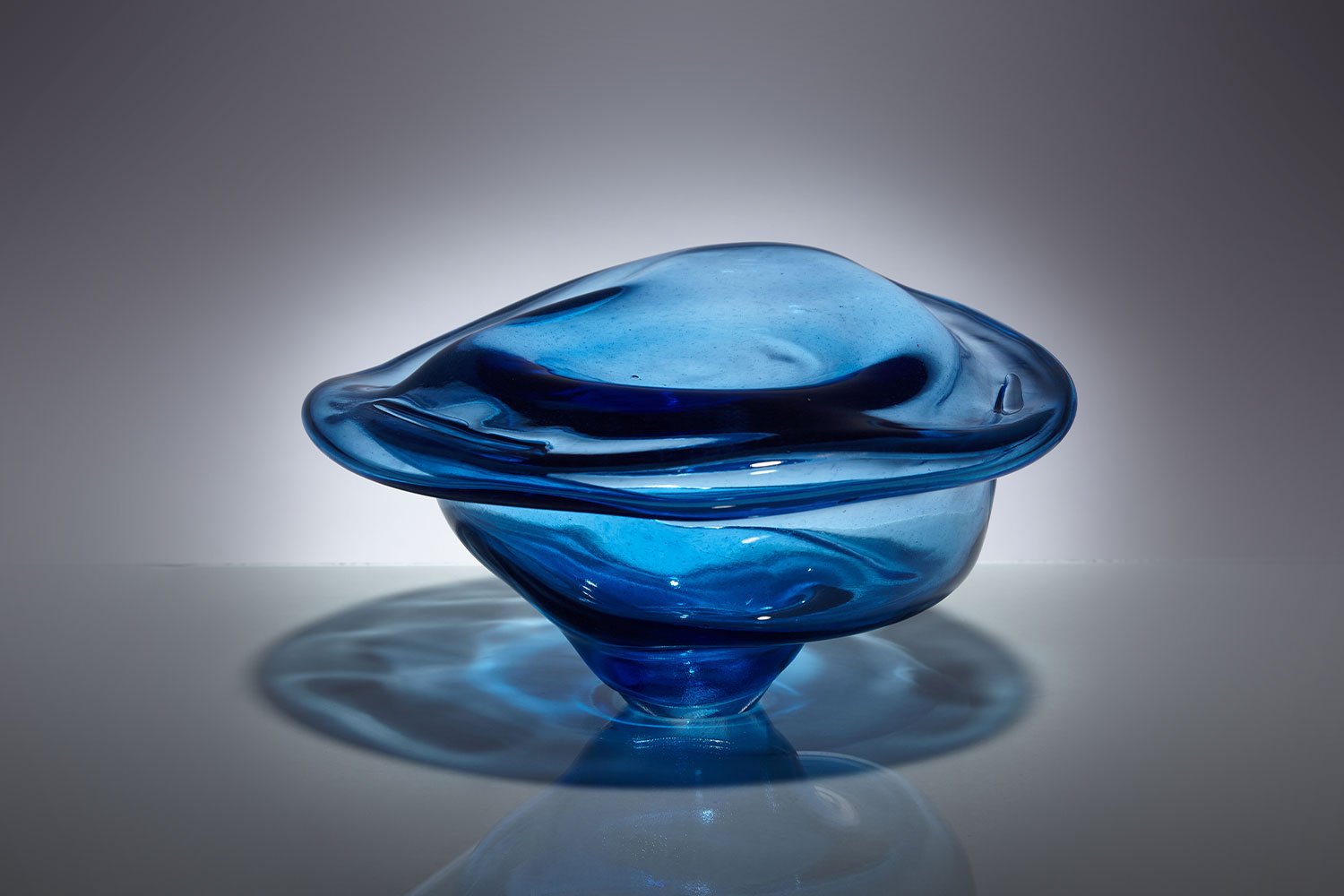 Cristina Ilinca shaped this blue hued glass sculpture using blown glass techniques and then worked the glass when in a molten state to achieve its final form.