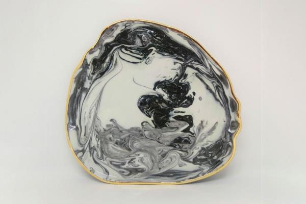 This set was especially made for the 2019 Lódź Design Festival, where Monika took part in the On The Table competition. Made of porcelain and gold pigment, the pieces were produced using slip casting. Due to this method, each piece has a singular pattern. Their organic shapes were inspired by the marks left by hands on fresh clay.