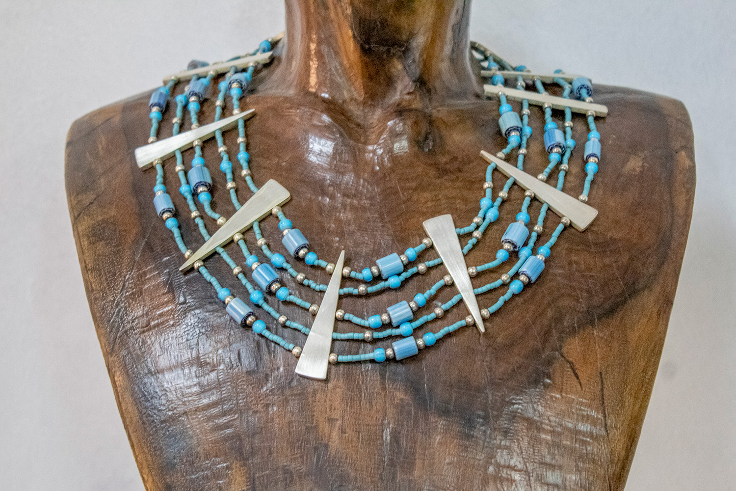 This necklace is made by stringing five hand-beaded strands through several triangular panels. These elongated triangles have been hand-rolled and cut, and are made of brushed and finished sterling silver. The panels point in alternate directions and provide a frame to the necklace. The strands feature a selection of turquoise and blue antique and contemporary African trade beads. These are interspersed with handmade sterling silver seed beads.
