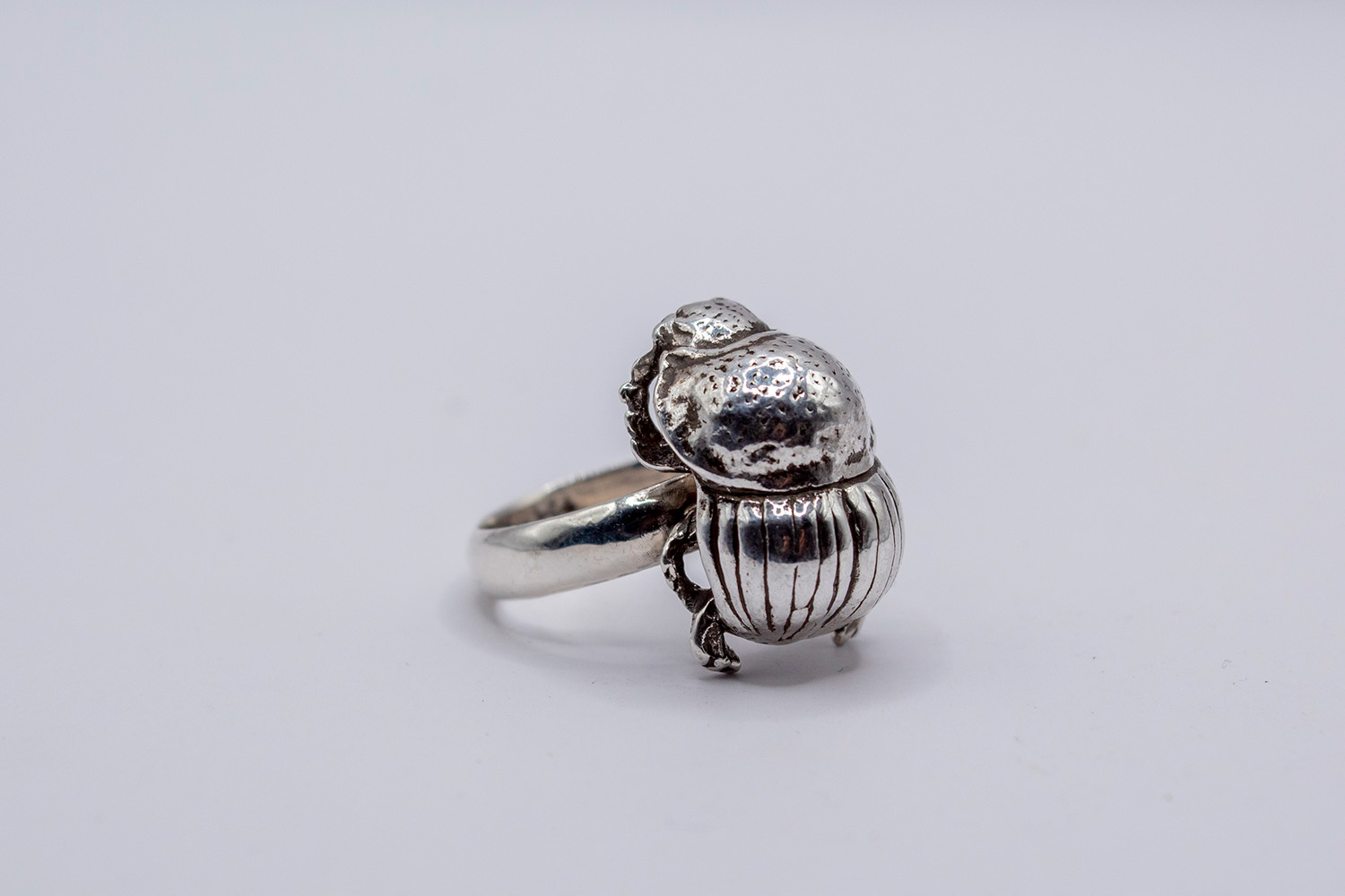 This ring is made of sterling silver using the lost-wax casting process. The head of the ring features a miniature dung beetle. It is cast from an original design carved by local artist Justice Mukali. The dung beetle is set on a half D-ring shank.