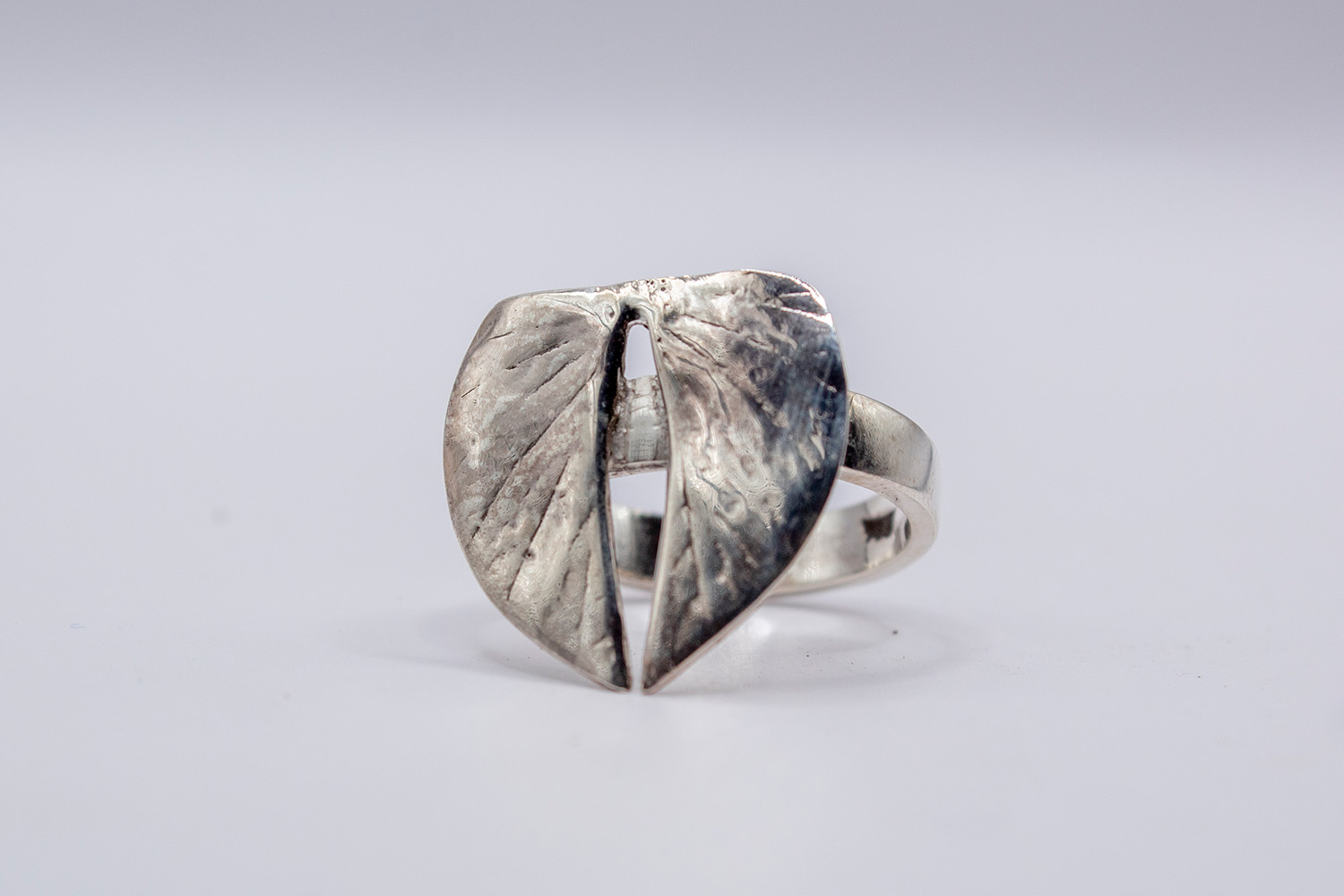 This ring is made of sterling silver using the lost-wax casting process. The head of the ring features a miniature heart-shaped leaf from the indigenous Mopane tree. It is cast from an original design created by artist Moses Kalembela and has fine-veined detail. The leaf is mounted on a flat band ring shank.