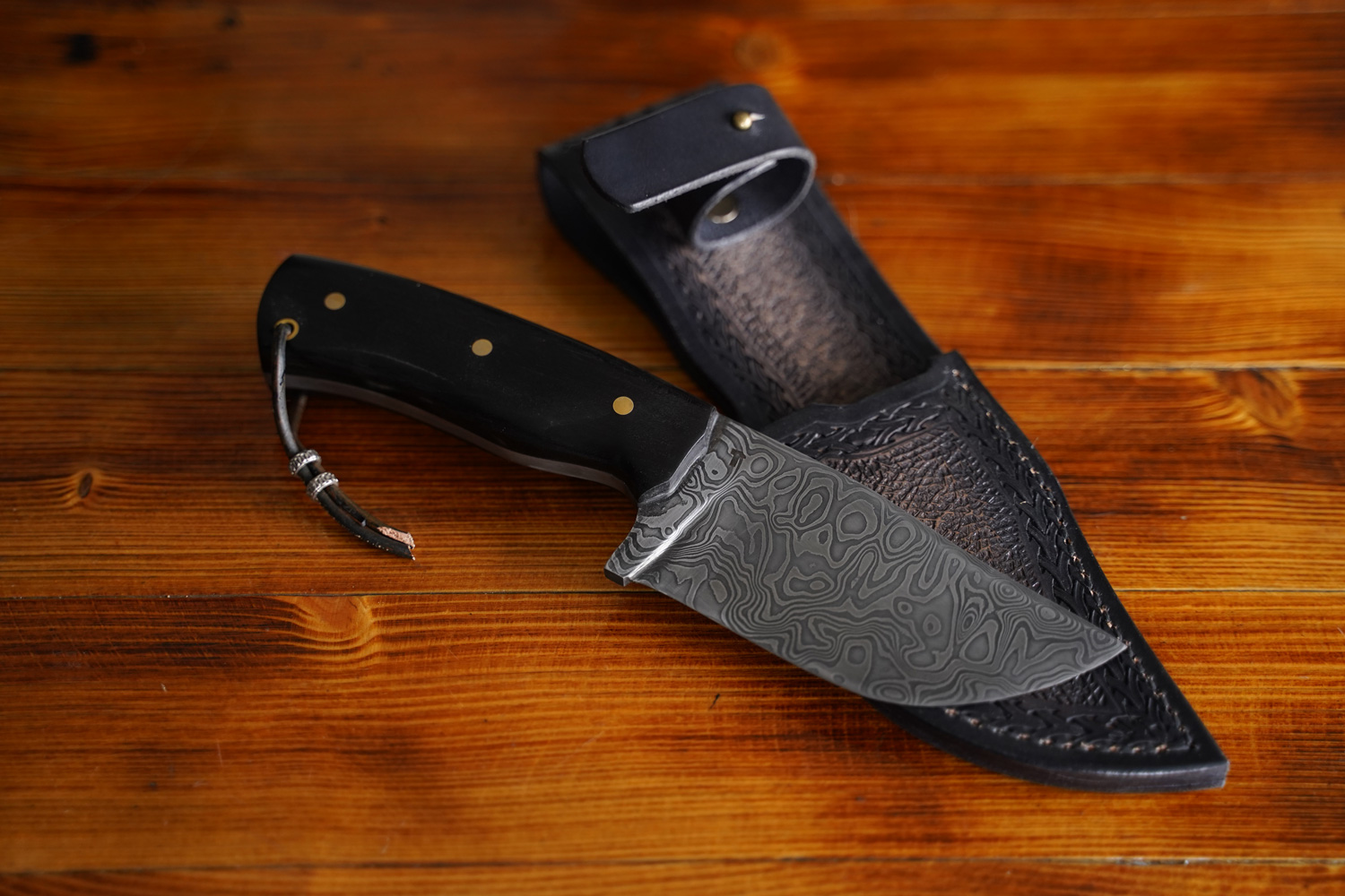 Dalibor Trkulja made this hunting knife from Damascus steel. The blade is 12cm long and has a full tang black oak handle. The case is made of vegetable tanned leather, hand-stamped and airbrushed in black.