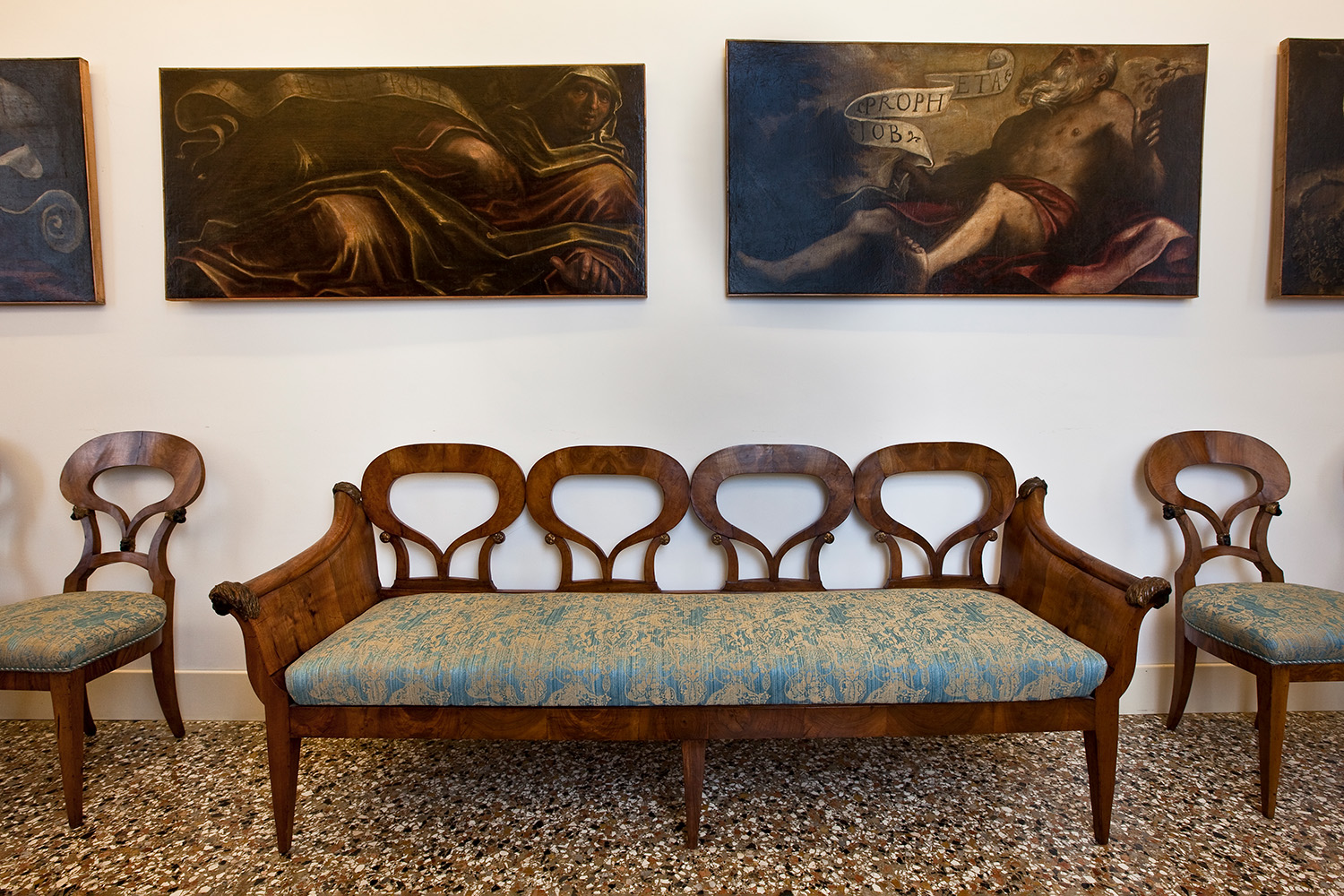 This sofa and chair ensemble date back to the 19th century. They live in a room of the Palazzo Patriarcale, and were restored and re-upholstered with Rubelli damask fabric.