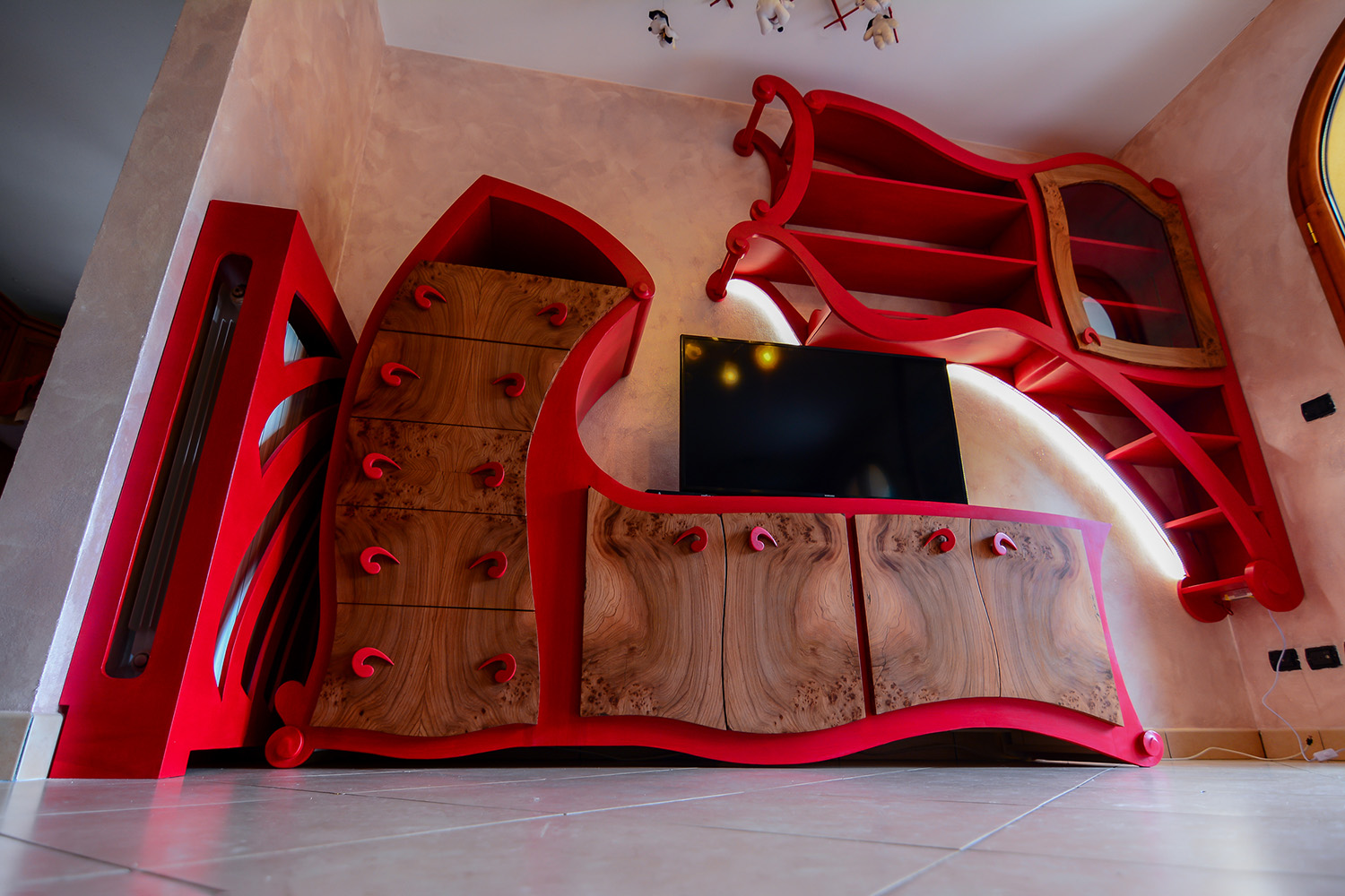 This piece of furniture was made on commission. Like so many pieces of Giuseppe Bruno’s surrealist and ironic furniture, which are meant to both entertain and evoke the Baroque artistic tradition, this sideboard reinterprets the past with joy and freedom. The red structure in poplar creates a strong contrast with the doors and drawers in elm briar.