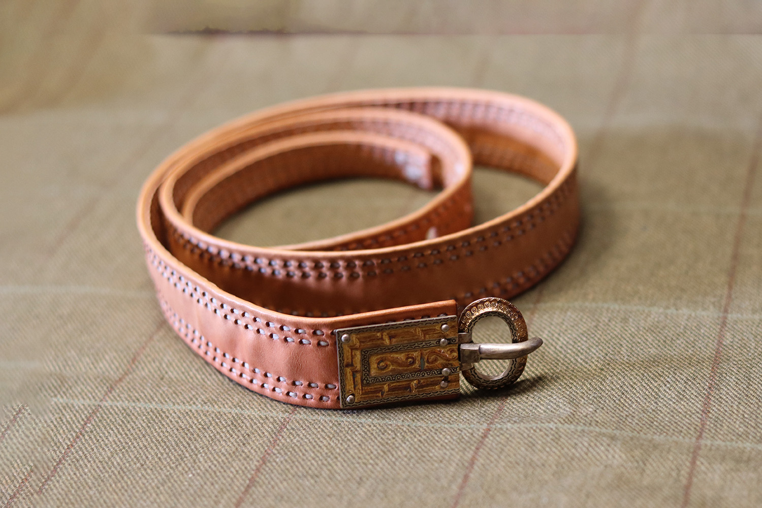This is a reconstruction of a 5th century women's belt. It is a decorative light brown leather belt with a gilded silver buckle. An interesting feature is that the buckle plating is made from a sword scabbard decoration.