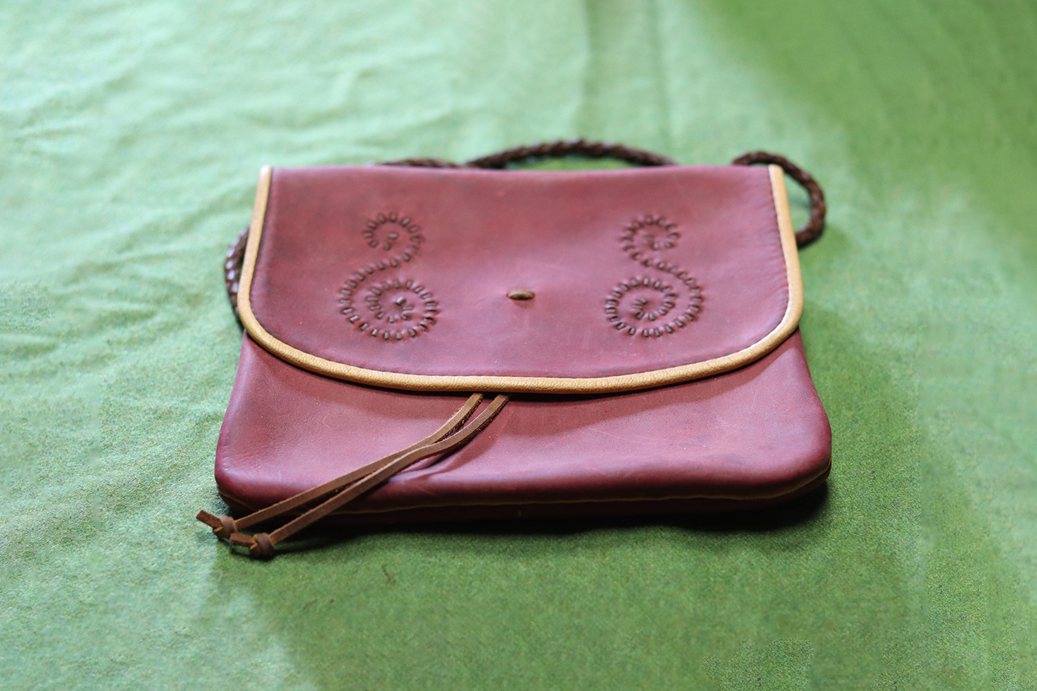 This handbag is based on surviving historical iconography. The decoration is typical of handbags of the 11th-13th centuries. In red-brown soft leather with a yellow band, it has two symmetrical geometric ornaments on the front.