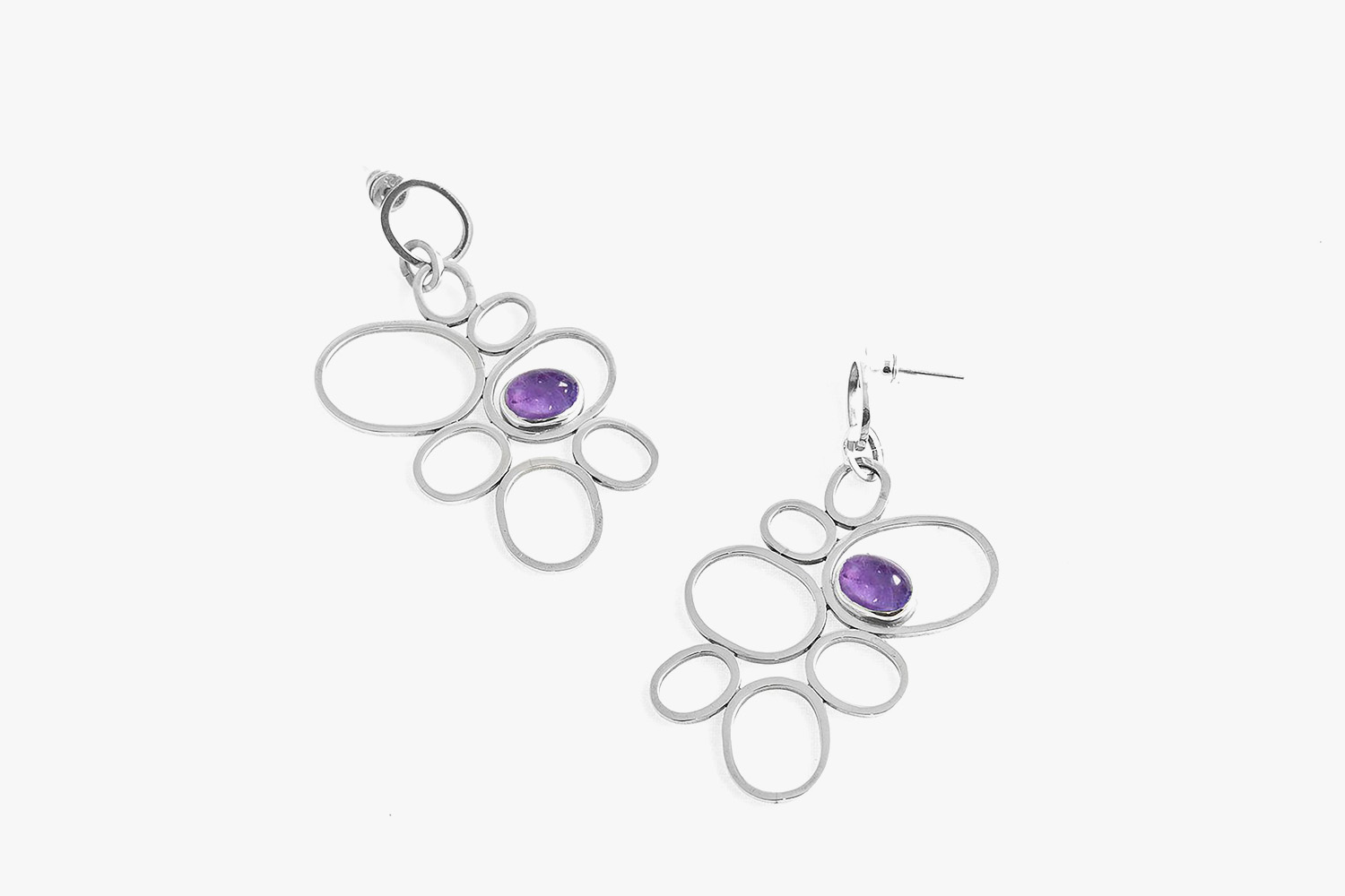 Part of the Silver Wings collection and inspired by the wings of exotic birds and plants, these earrings have a feminine look, represented by the repetitive oval shape. A single form evolves into to a multitude of shapes and directions. The earrings are constructed in sterling silver, with different oval shapes soldered together, combined with two amethyst cabochons in bezel setting.