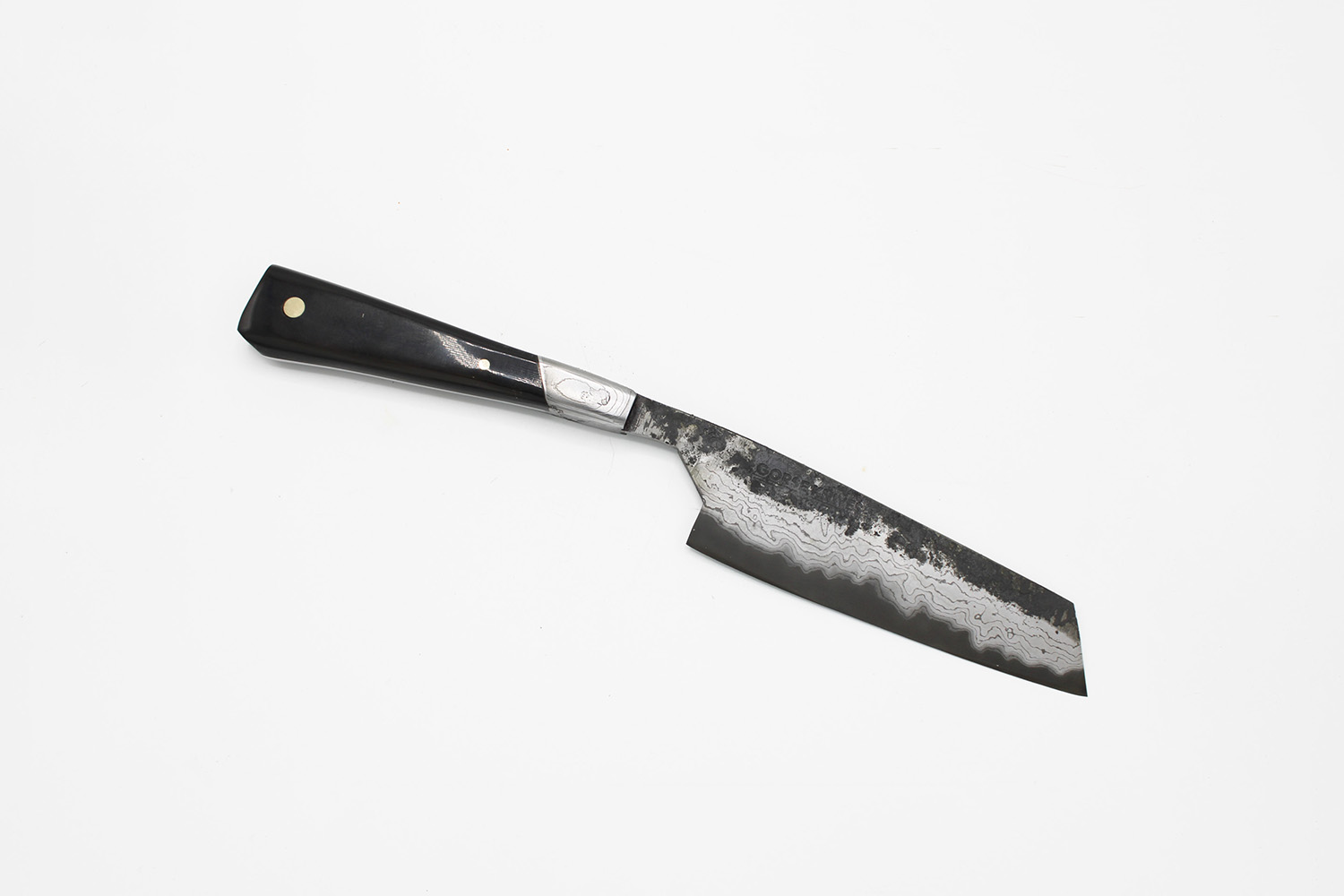 The Petty knife is a smaller knife used for delicate kitchen work. This knife has polished buffalo horn and brass pins for the handle. The horn displays a rich black glossiness that contrasts with the gold of the brass. The blade is made of hand forged blue paper steel with layered steel cladding resembling marble and a sharp, black edge.