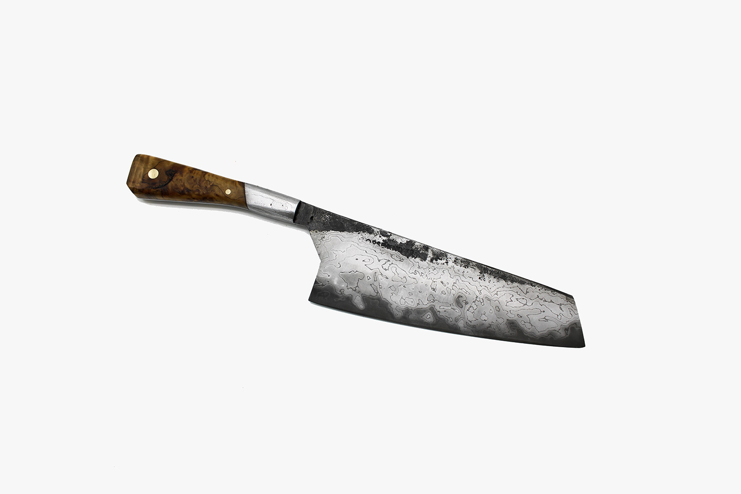 This Santoku knife has a shorter, wider blade for tougher kitchen work. The walnut in the handle shows intermingling shades of brown and muted gold, and the blade of hand forged blue paper steel with layered steel cladding displays distinctive layers. The blade has a slight curve in its belly and a pointed tip.