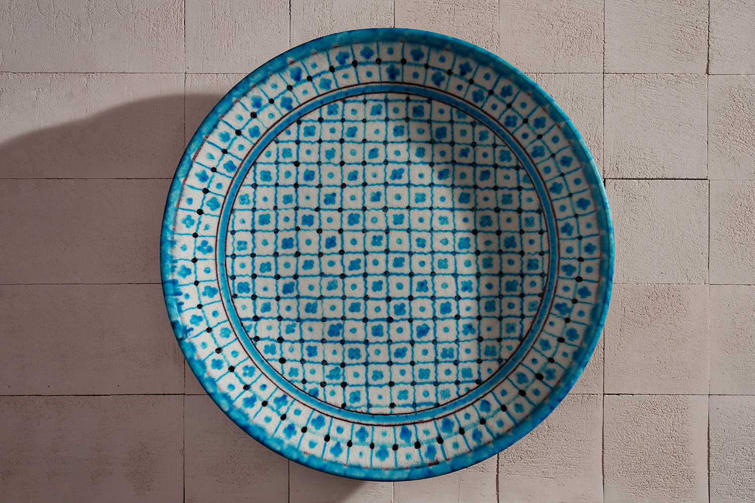 This lyagan is made on a mechanical modelling machine from red clay and coated with white engobe by the pouring method. After the initial firing, it is dusted with a damp sponge and covered with a decor sketch in pencil. The style of the decor is inspired by Bukhara traditional ceramics of the 18th and 19th centuries. The decor is then applied with manganese and copper oxides with the Bosma and Kalami methods with the Pahtali-Bosma tool.