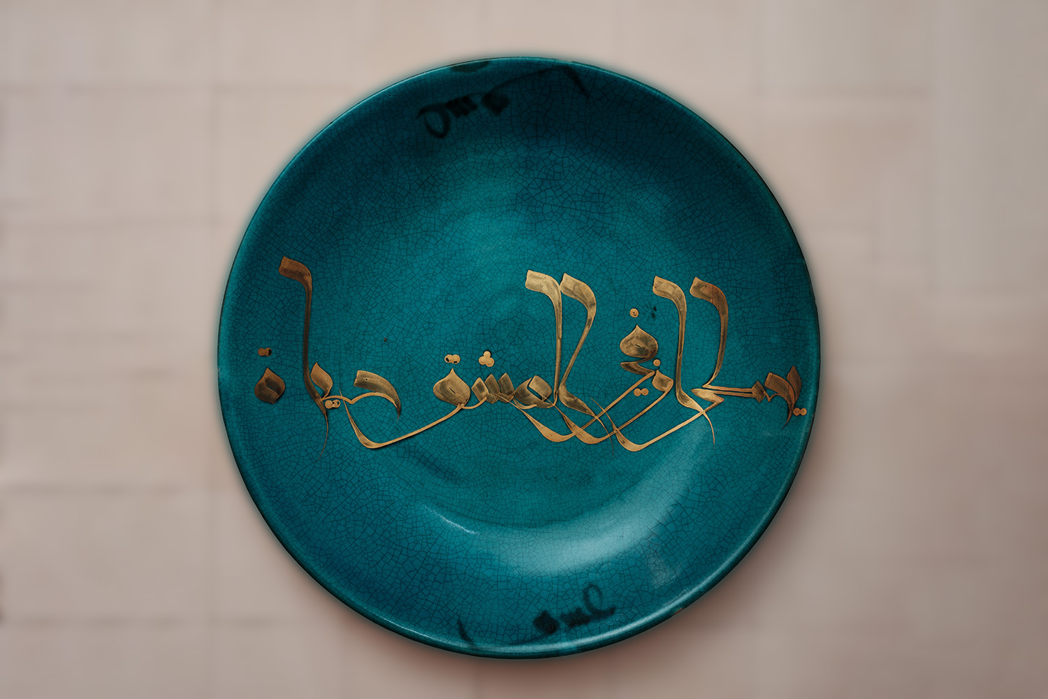 This is one of the creative works inspired by the ceramics of the 9th and 11th centuries. On the edges in dark green (copper oxide) there is the inscription 'Love'. The lyagan is covered with a turquoise glaze and after the second firing at 980°C it was decorated with gold. In the middle of the lyagan, in Arabic handwriting, is a saying by Rumi.