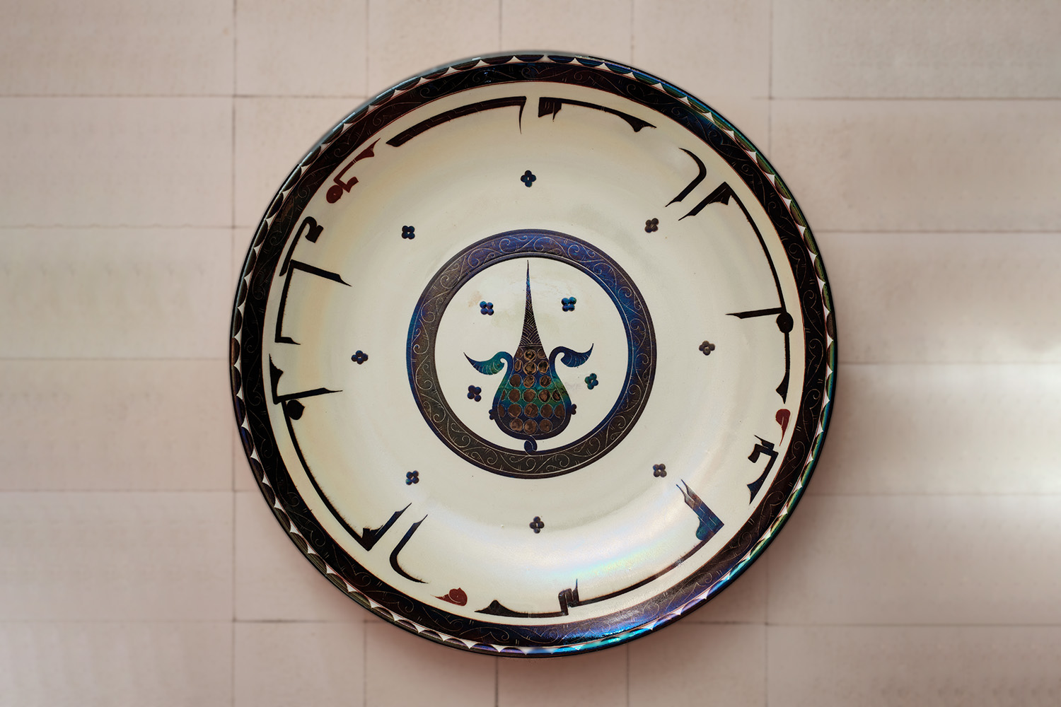 The Eastern ceramics of the 9th to 12th centuries are important. This piece, Consideration, strict and luxuriously flowered with split letters and inscriptions in Kufi handwriting, captured his imagination. He scrupulously studied the technique of calligraphy on ceramics based on fragments of the mentioned period. The result was a series on Epigraphic decoration in the style of the Samanid period. He managed to understand the principle, technique and what tools and brushes were used by the Samanid masters.