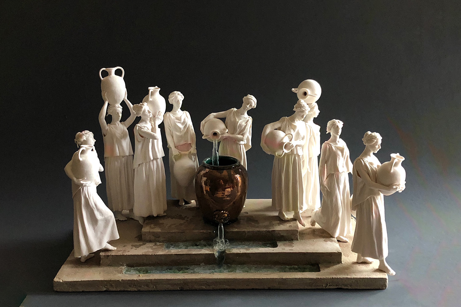 On a red sandstone base stand a number of Danaids, hand modelled and sculpted in porcelain. Glass is used to represent water. Six firings from 1200°C to 600°C were required. All the subjects are worked individually before being glued to enamel.