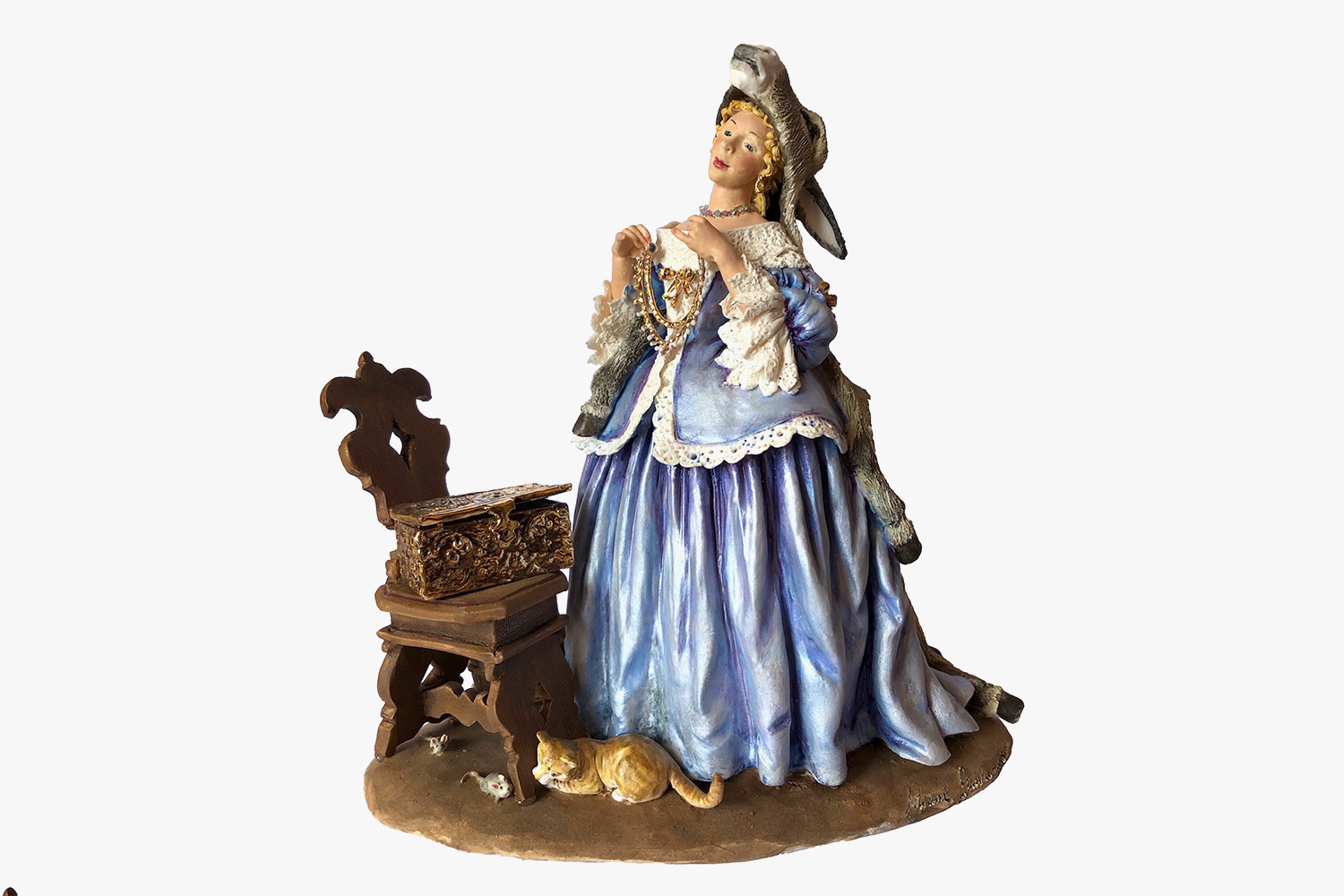 This piece is entirely handmade, modelled and then sculpted. It is dressed in thin layers of porcelain sheets that are draped, gathered and resculpted, coloured with oxides, and fired with seven degressive firing temperatures from 1200°C to 600°C.