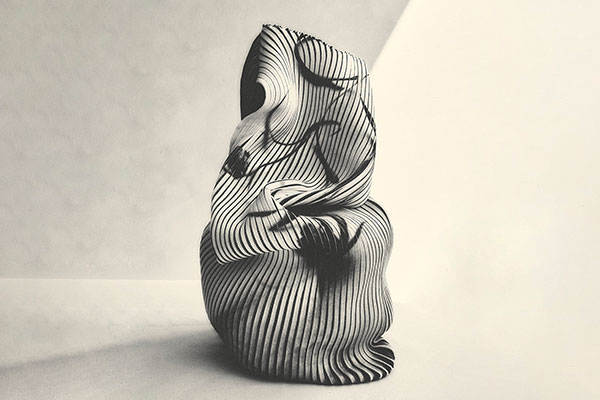 The Summer knitted piece from the Dust of Time series is an exquisite soft sculpture, crafted from polyester yarn. This unique sculpture showcases a captivating photograph, personally taken by Yu Mei Huang, which is printed onto one side of the pleats. The printed image captures a vision of summer and is rendered in a monochrome colour scheme.