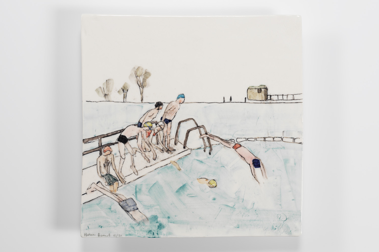 This is a hand-rolled porcelain tile that was hand-painted. The illustration is of swimmers diving into water.