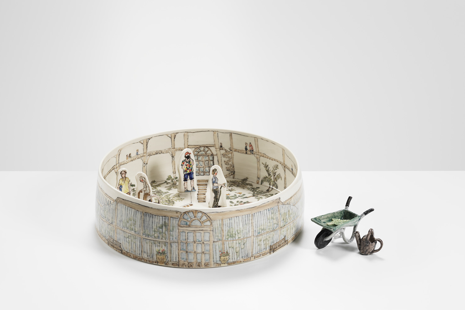 This is a one-of-a-kind installation, consisting of a large porcelain bowl with small handmade porcelain figures and garden props. All were hand-painted.