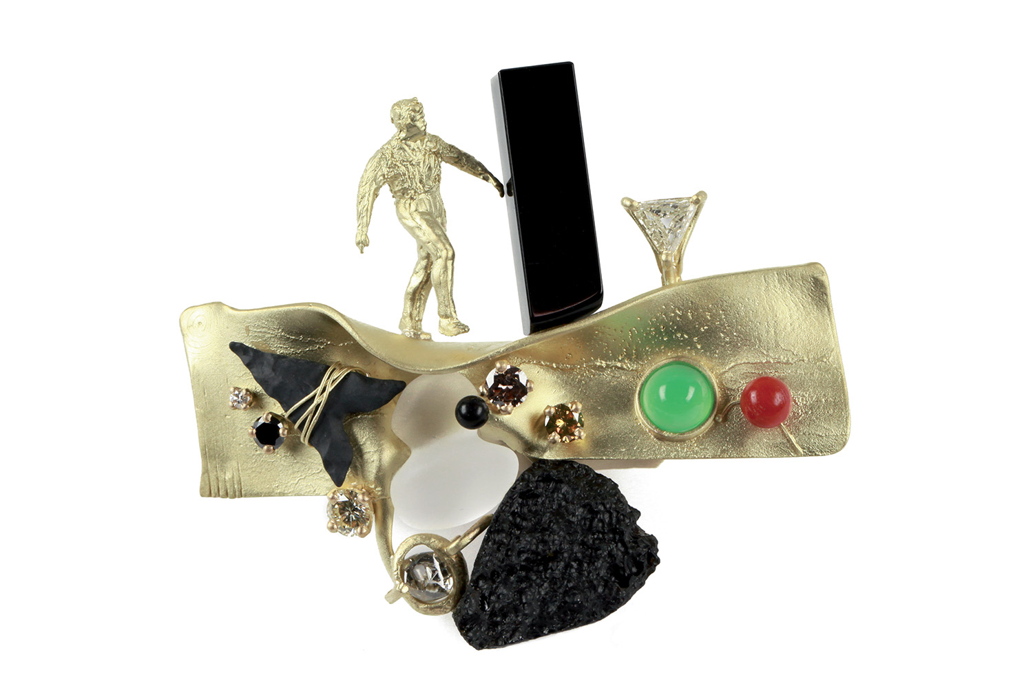 This is a gold brooch depicting a man walking to the right on a gold band and touching the mirror-like surface of a black monolith with his left hand. The gold support is set with various stones and a prehistoric arrowhead delicately tied with golden threads. The piece is a homage to Stanley Kubrick.