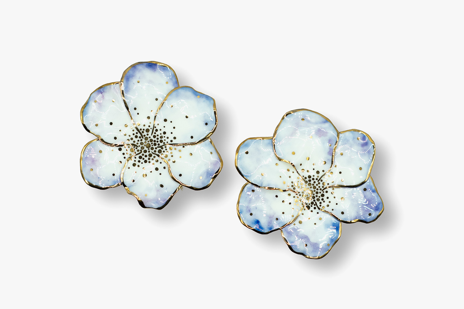 These are soft blue abstract flower shaped earrings that were hand modelled in porcelain and adorned with 24 carat gold.