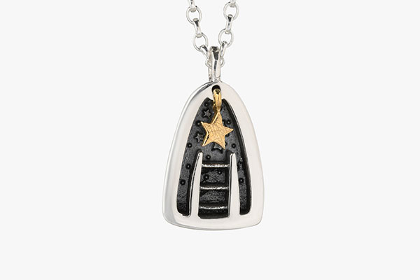 This is a circular kinetic pendant. As the wearer turns their head, the chain activates tiny cogs within the design and the gold wheels begin to spin.