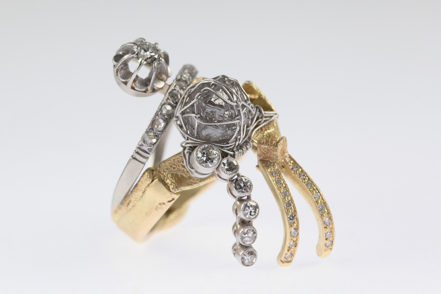 This ring is from the series called Une Vie, composed of a two-colour assemblage of ancient and modern elements, sometimes mobile, evoking the trail of a comet.
