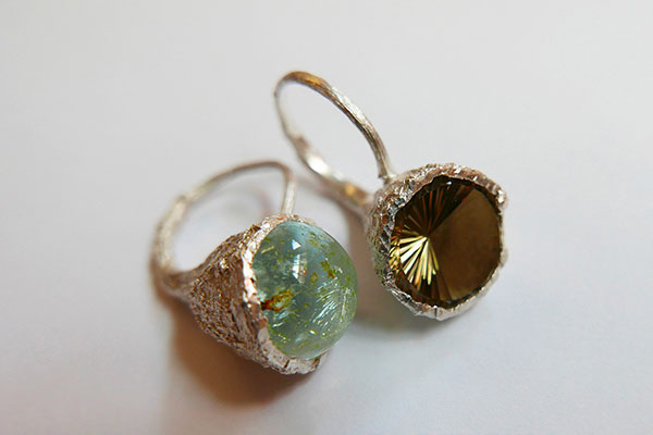 A botanical garden left to its own devices on La Gomera was the inspiration for these gems. Overgrown, abandoned and untidy, the plants were allowed to grow as they wished. Instead of the fruits, Sabine set precious stones such as topaz or smoky quartz in the capsules made from silver and formed them into rings.
