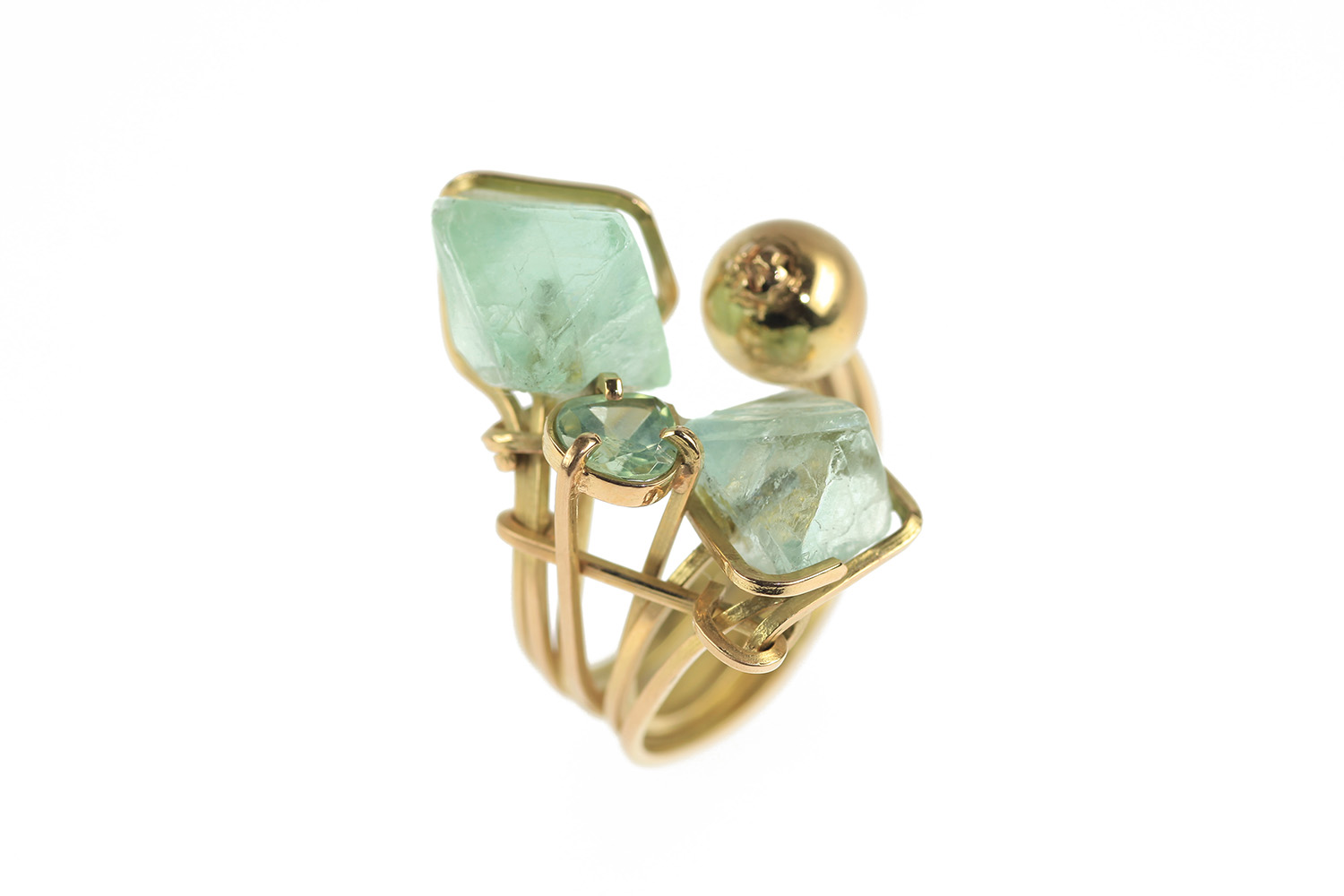 This is a yellow gold ring made of golden wires. One end is decorated with a gold sphere, the other end supports three stones: two octogon crystals of green fluorite which flank a faceted green tourmaline cut into a heart shape.