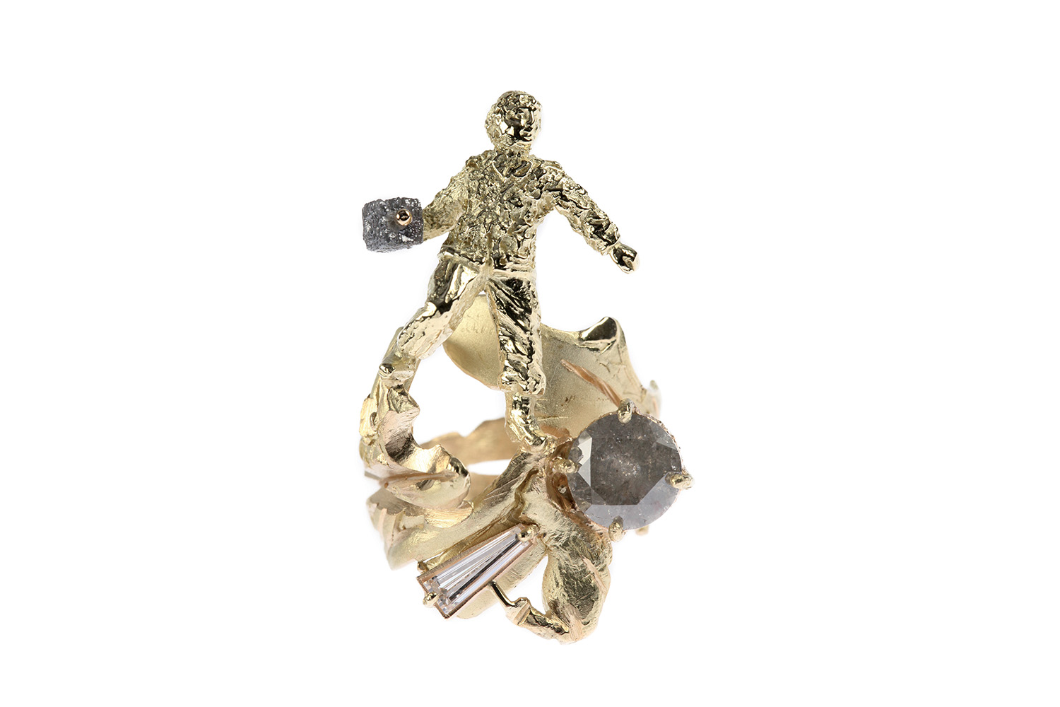 This ring from the series called Une Vie represents a standing gold boy figure walking on a chaotic gold surface set with two faceted diamonds. In his right hand, the boy holds a cubic grey diamond as if he is about to throw it into the air.