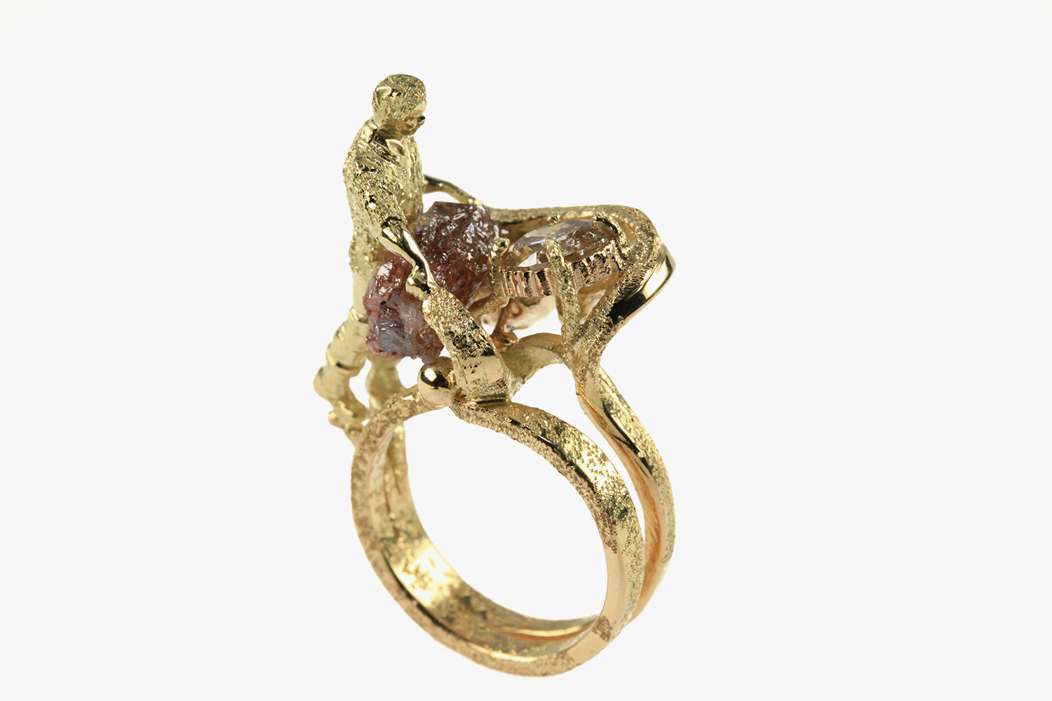 This gold ring is from the series called Une Vie. It depicts a man standing on the ring body and contemplating two diamonds, a rough diamond crystal and a faceted diamond, in pink hues. The gold surface of the ring body is fully textured.