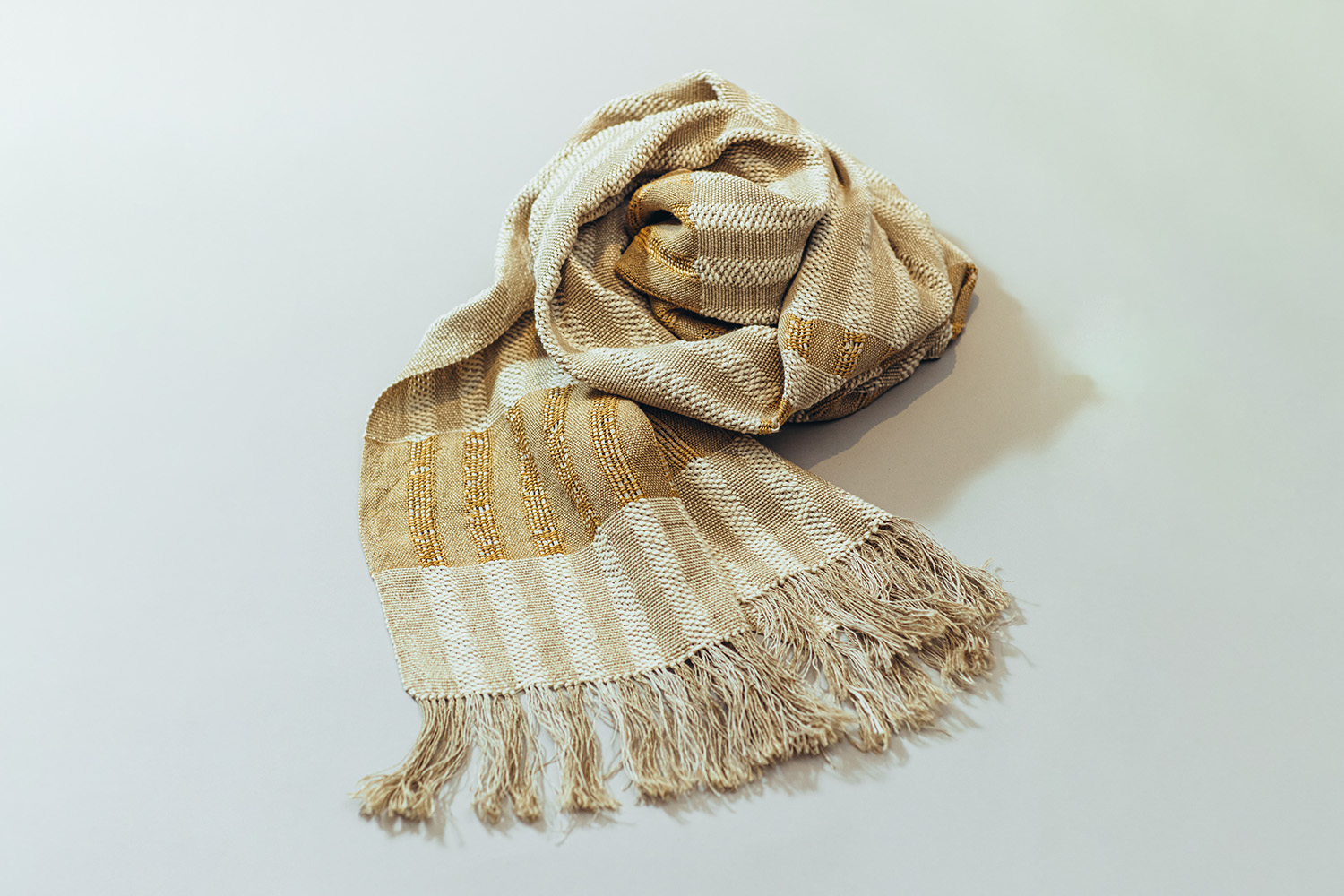 This is a soft touch wrap shawl, in gold and off-white. It is woven on the handloom with linen and cotton fibres with traceability. The technique used is the composite taffeta weave. The finish is a loose fringe.