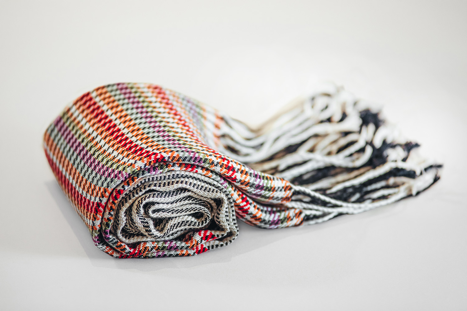 This is a shawl made on the manual loom. It is a black and white linen warp. For its weft, Marisol Ramos Leo has used up to seven different colours such as red, white, orange, turquoise, purple and green in combination with the natural colour of the linen. The technique used is the twill weave. For its finishing the fringes were twisted by hand.