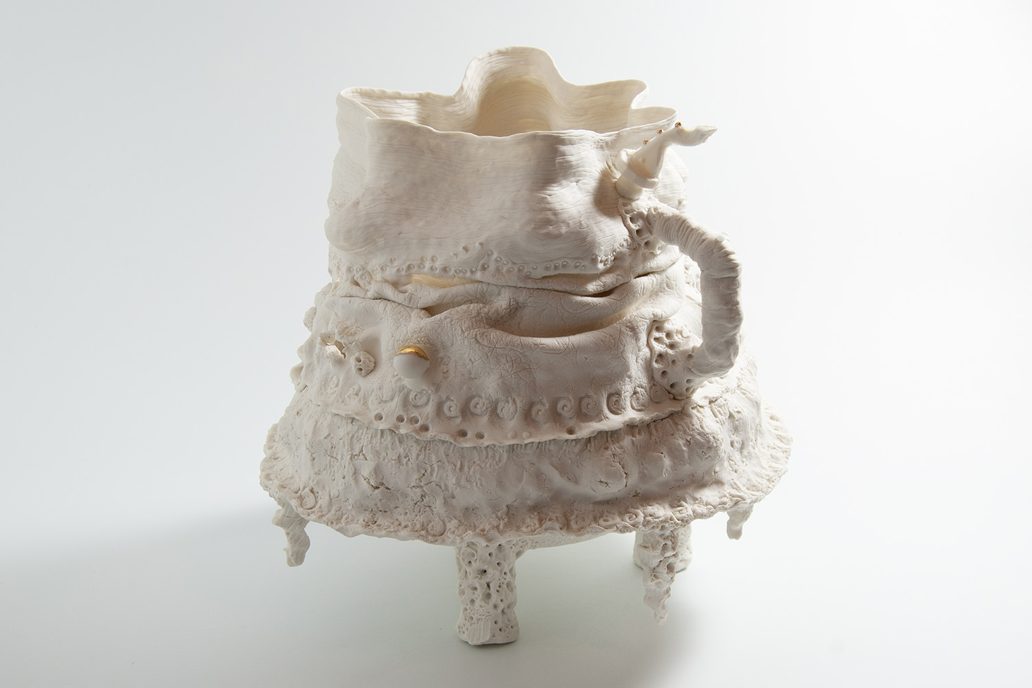 This jug, with an inverted conical shape and three feet, seems to be moving forward. It is made of porcelain with slab building, coiling and pinching. It is about 30 cm tall, which is quite imposing, yet the fineness of the porcelain makes it seem fragile. The voluptuous shapes, the holes, the roughness and the details offer something new every day.