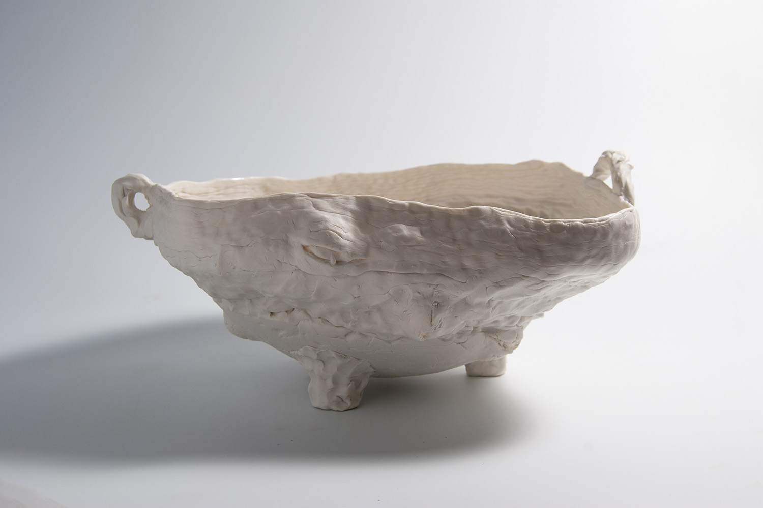 A pot, shaped like an inverted cone on three legs, seems to be walking. Made of English porcelain with slab building, coiling and pinching techniques,the folds, voluptuous shapes and textures bring it to life. The matte, unglazed exterior gives it a raw edge, the transparent glaze on the inside a soft touch.