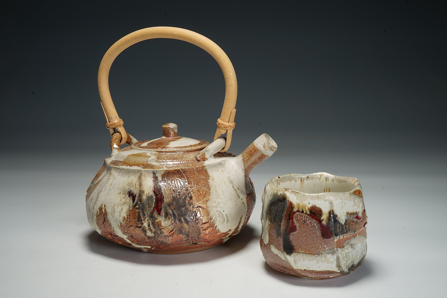 Wheel thrown and wood fired, this tea set was made with a natural feldspar glaze as a splash. Unglazed clay in parts shows the burnt flashing from the wood kiln.