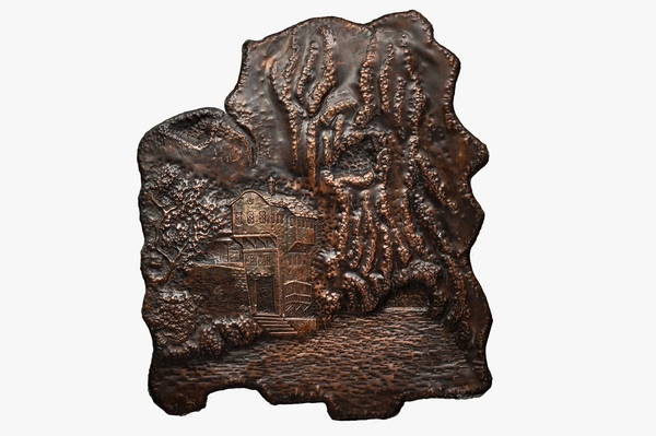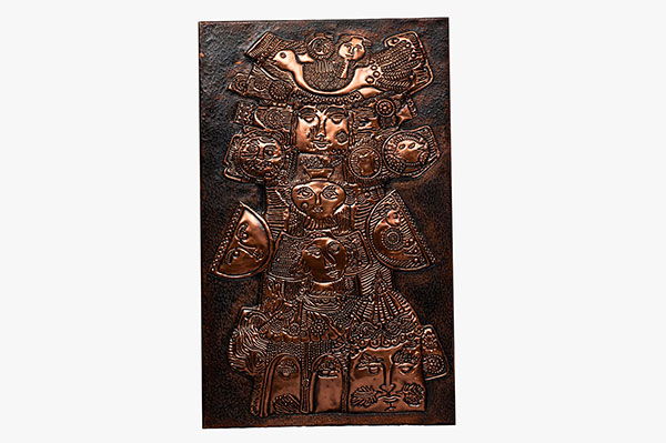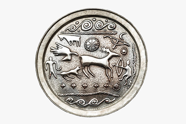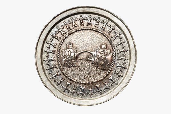 This is a handmade copper tray, tin plated and decorated with motifs of kolo, a traditional Slavic circular dance.