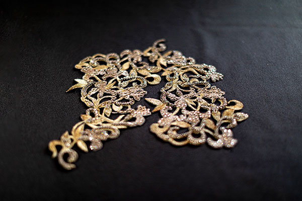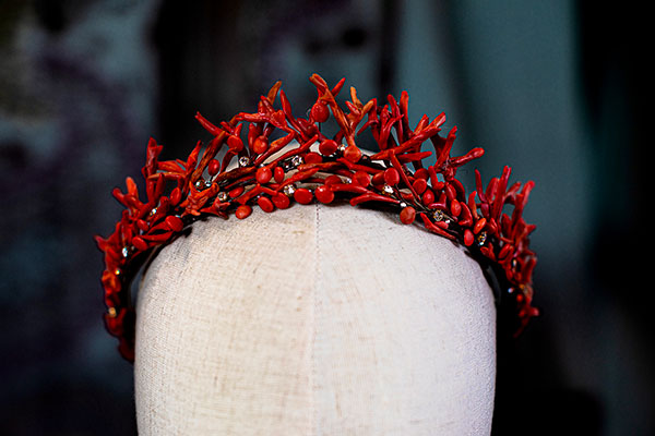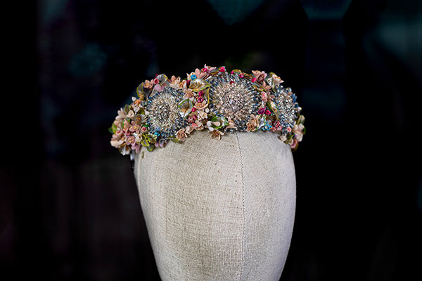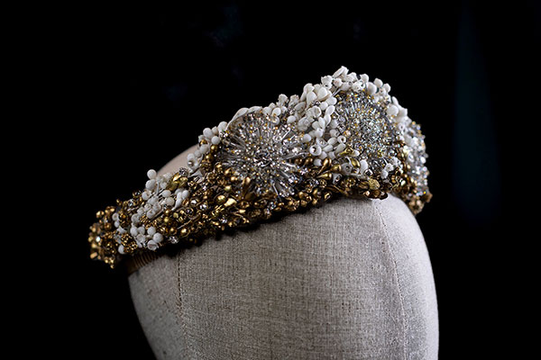 This tiara is inspired by ®Cartier’s Laurel Tiara of 1930 and designed with a special pattern to adapt it to today's wearer. Its daisy flowers are embroidered with silver, smoke and aquamarine-coloured crystals. It was made with overlapping elements to create a relief effect.