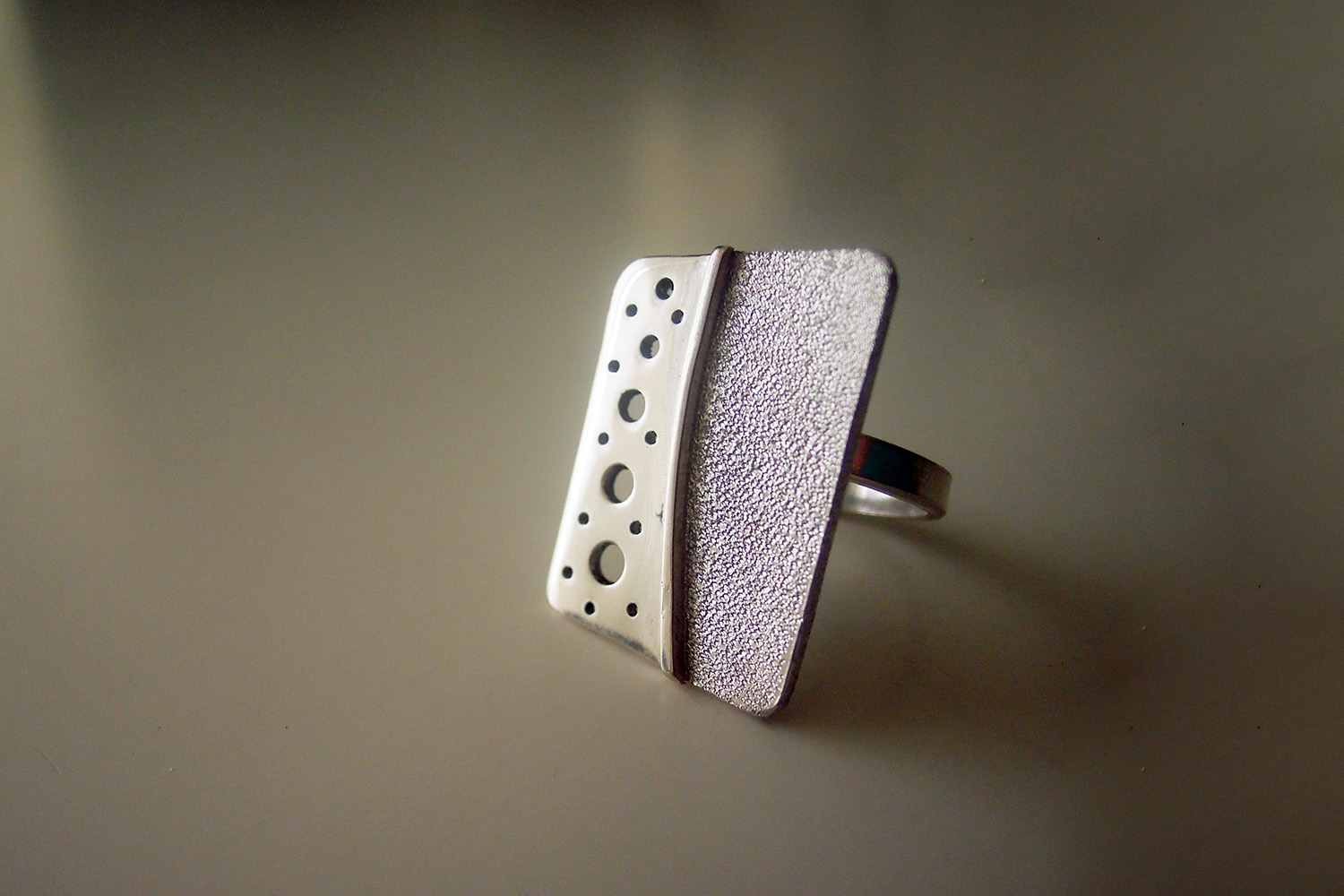This is a ring composed of two sections. One part has a very rough and shiny texture, with a glitter effect. The other is smooth and mirrored and has very small perforations all over the surface.