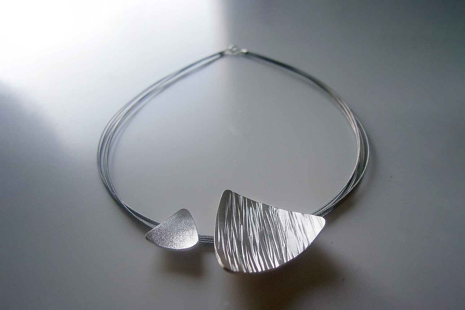 This pendant is composed of several intertwined steel lingas. It has two silver pieces in the shape of a concave triangle. One of the pieces is very small, rough textured and shiny. The other is large with a texture of overlapping curved lines and a satin finish.