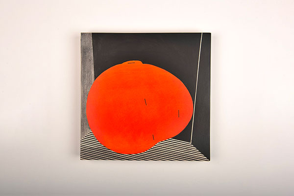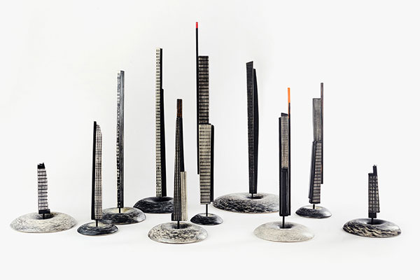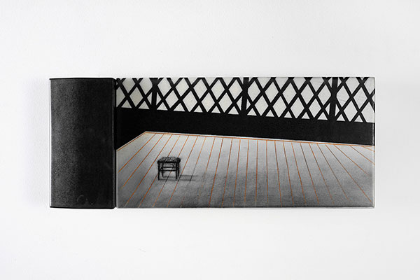 These two sculptural objects are shaped like square vases. Both of them have a metal plate foundation. The drawings on them were created by hand, using black pigment, then covered with a transparent glaze. The pieces were fired in an electric kiln.
