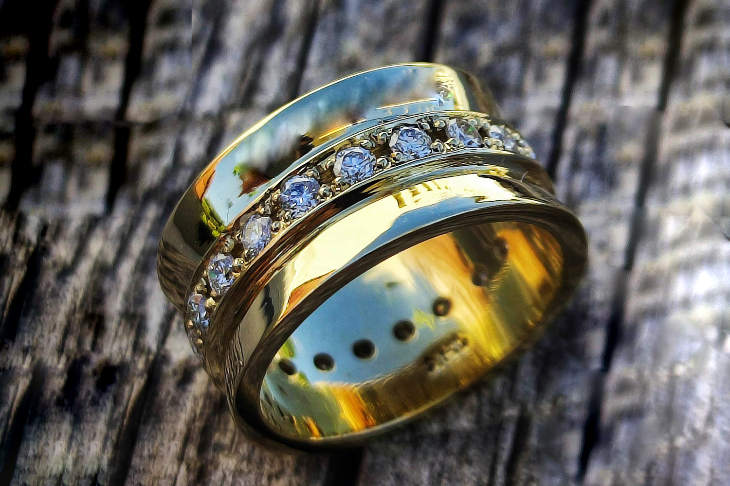 This is a ring in mirror polished gold, with a large width and deep curve. Its central band incorporates 22 brilliant-cut diamonds, set in an endless band that completely envelops the piece, enhancing its luminosity.