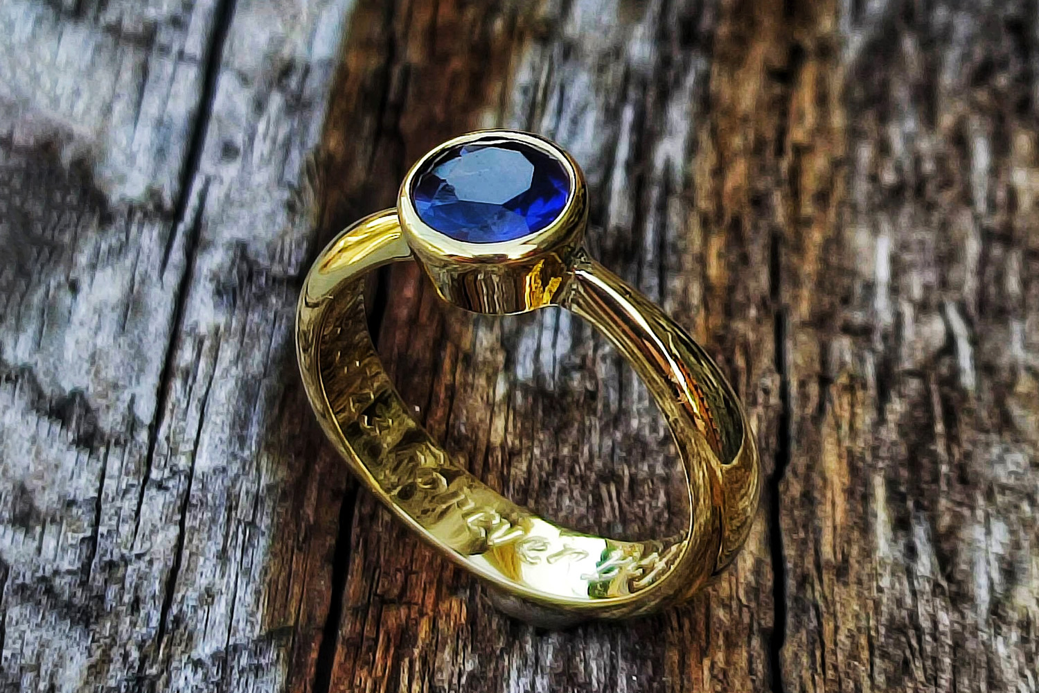 This delicate ring is a mirror-polished half-round wedding band with a flared English-style setting of a deep blue sapphire. The combination of colours and the stripped-down design give the piece a timeless beauty.